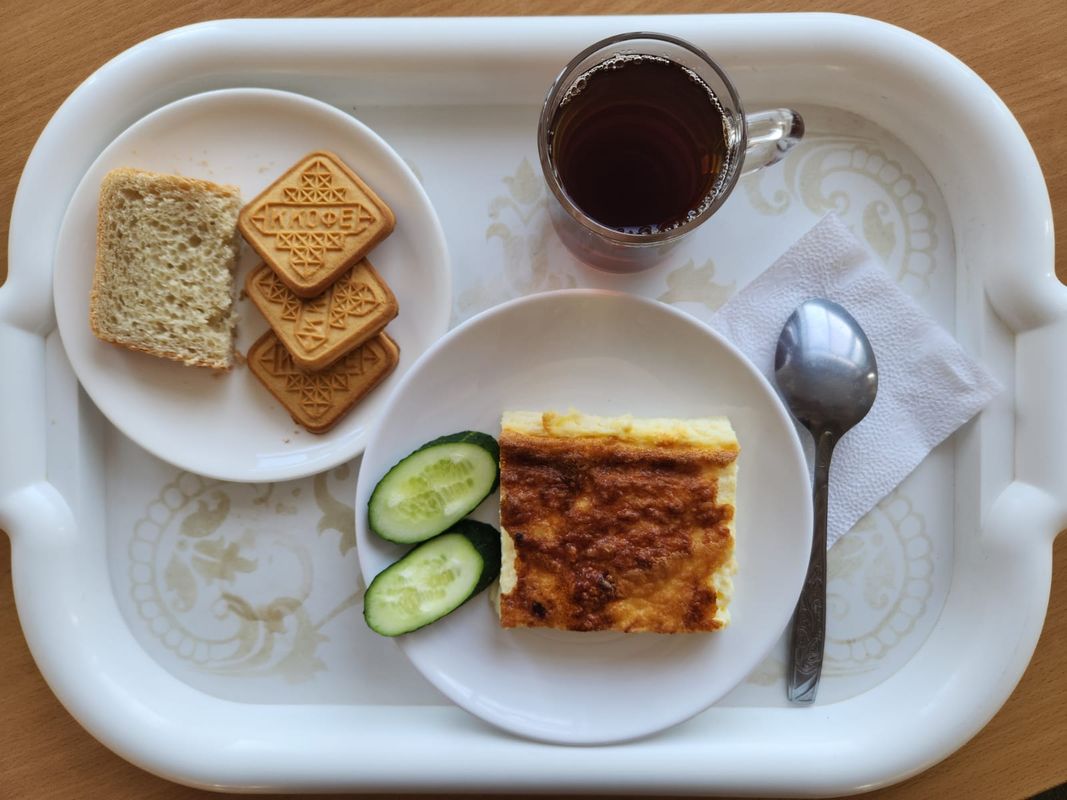 День 7. Омлет натуральный, овощи натуральные свежие (огурцы), чай с сахаром, хлеб пшеничный, кондитерское изделие.