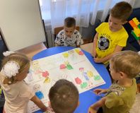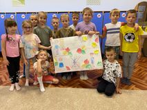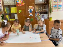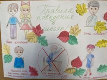 В 1-ых классах сейчас период адаптации. Ребята знакомятся друг с другом, узнают правила поведения в школе, такие как «Не выкрикивать с места», «Поднимать руку, если хочешь ответить или спросить», «Уметь слушать» и т.д. Ученики 1 «Б» класса совместно с педагогом - организатором Юлией Юрьевной Петровой придумали школьные знаки и изготовили стенгазету.