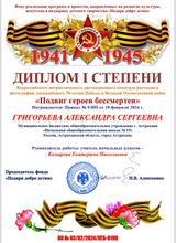 Ученица 1 «Г» класса - Григорьева Александра приняла участие во Всероссийском патриотическом конкурсе рисунков и фотографии «Подвиг героев бессмертен», организованном фондом «Подари добро детям». Александра награждена Дипломом I степени. В своём рисунке она отразила желание всех людей - Мир на всей планете.